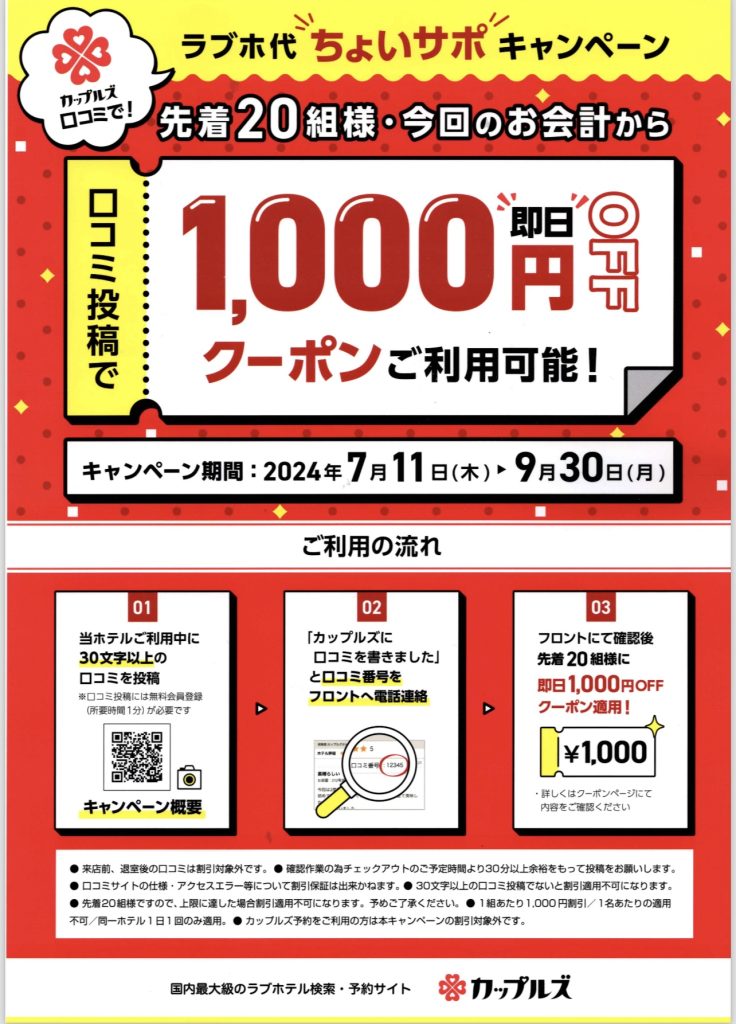 2024年7月11日(木)から『ホテル代 1,000円OFF口コミキャンペーン開催!!』ホテル客室に置いてある【カップルズ様提供】のPOPのQRコードを読み取ってカップルズサイトで口コミを書いて、フロントに連絡するとホテル代が1,000円引になります。※20組様限定ですのでお早めにご利用下さい。